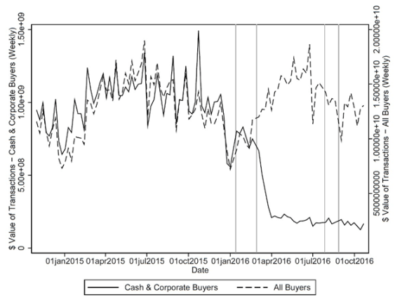 First, here’s a graph showing the weekly dollar value of real estate transactions over the 2015-2016 period. The solid line represents cash purchases by companies; the dashed line represents all other purchases (purchases with a mortgage, by an individual, or both). The scales are different, but the purchase volumes move in lockstep right up until the first GTO goes into effect in March 2016, after which point all-cash purchases by companies crater: