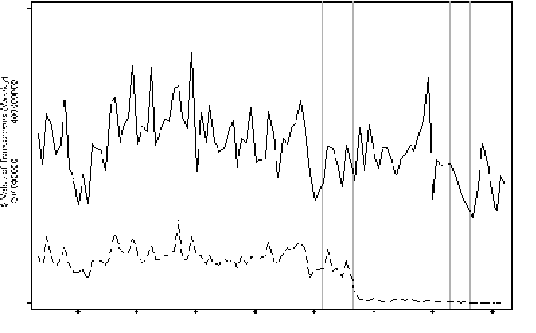 And here’s a second picture, limited to Miami-Dade County. (Apologies but for some reason the scale and axis labeling gets screwed up when I copy the figure—you can find the original on p. 27 of the working paper. The time scale on the x-axis is the same, and the vertical gray lines again represent the dates for GTO announcement and implementation.) Here for some reason the authors have reversed the coding such that the dashed line represents cash purchases by companies and the solid line represents all other purchases, but the bottom-line result is basically the same: Cash purchases by companies were a significant part of the Miami real estate market before the Miami GTO went into effect in March 2016, and after that date such purchases dried up almost entirely.