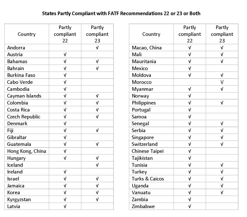 Unfortunately, in the case of Recommendations 22 and 23 the theory has not proven out. Four G20 members – Australia, Canada, the People’s Republic of China, and the United States – have refused to comply with either recommendation (here). FATF data show another 48 jurisdictions, listed below, have only partially complied with either Recommendation 22 or 23 or both. Partial compliance can mean that an important profession – lawyers in Denmark, real estate agents in Singapore – is not covered. It can also mean no firm or individual has ever reported a suspicious transaction or that the sanctions for failing to report are mild.