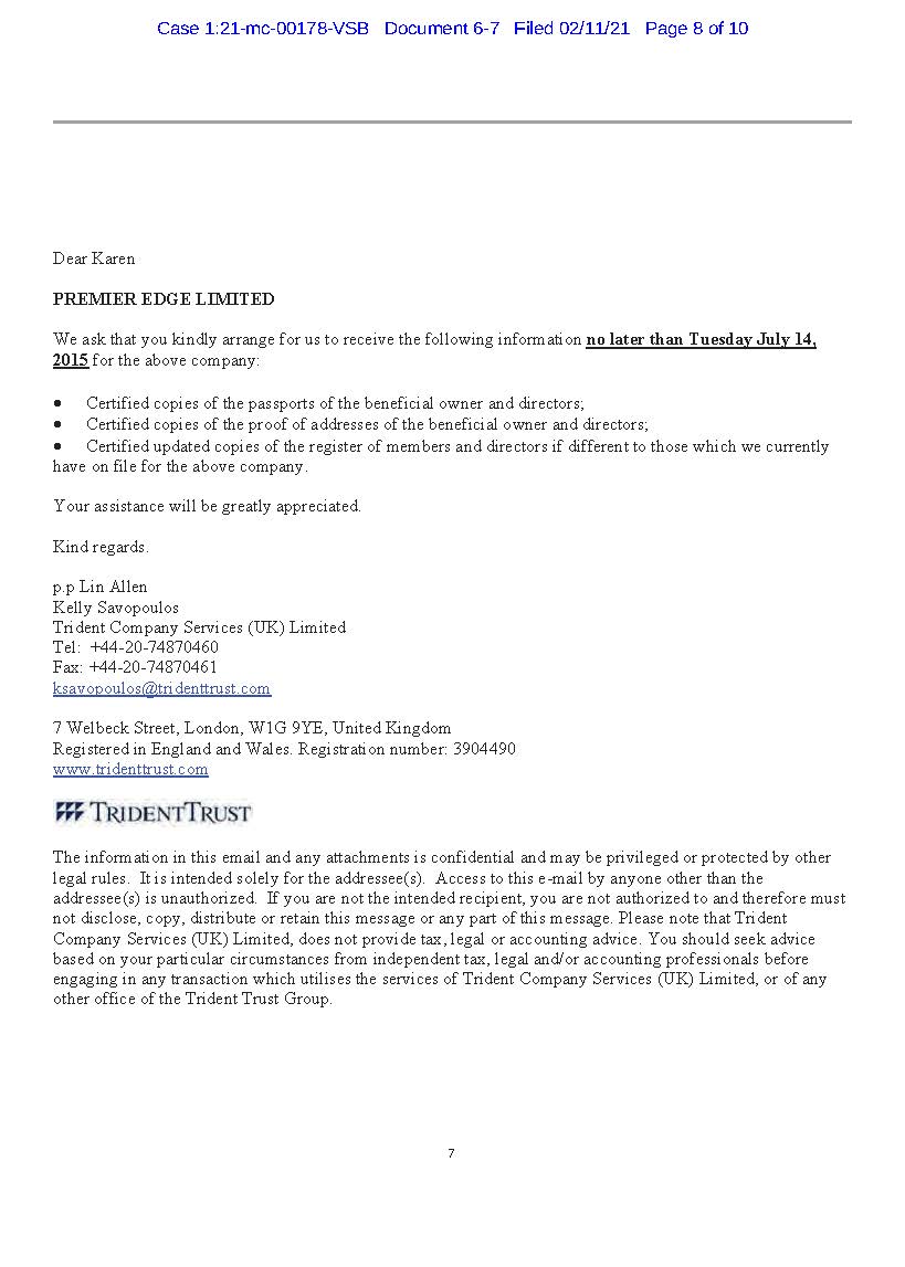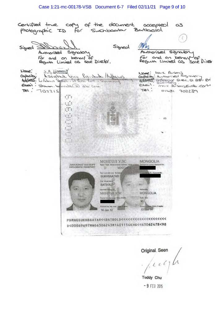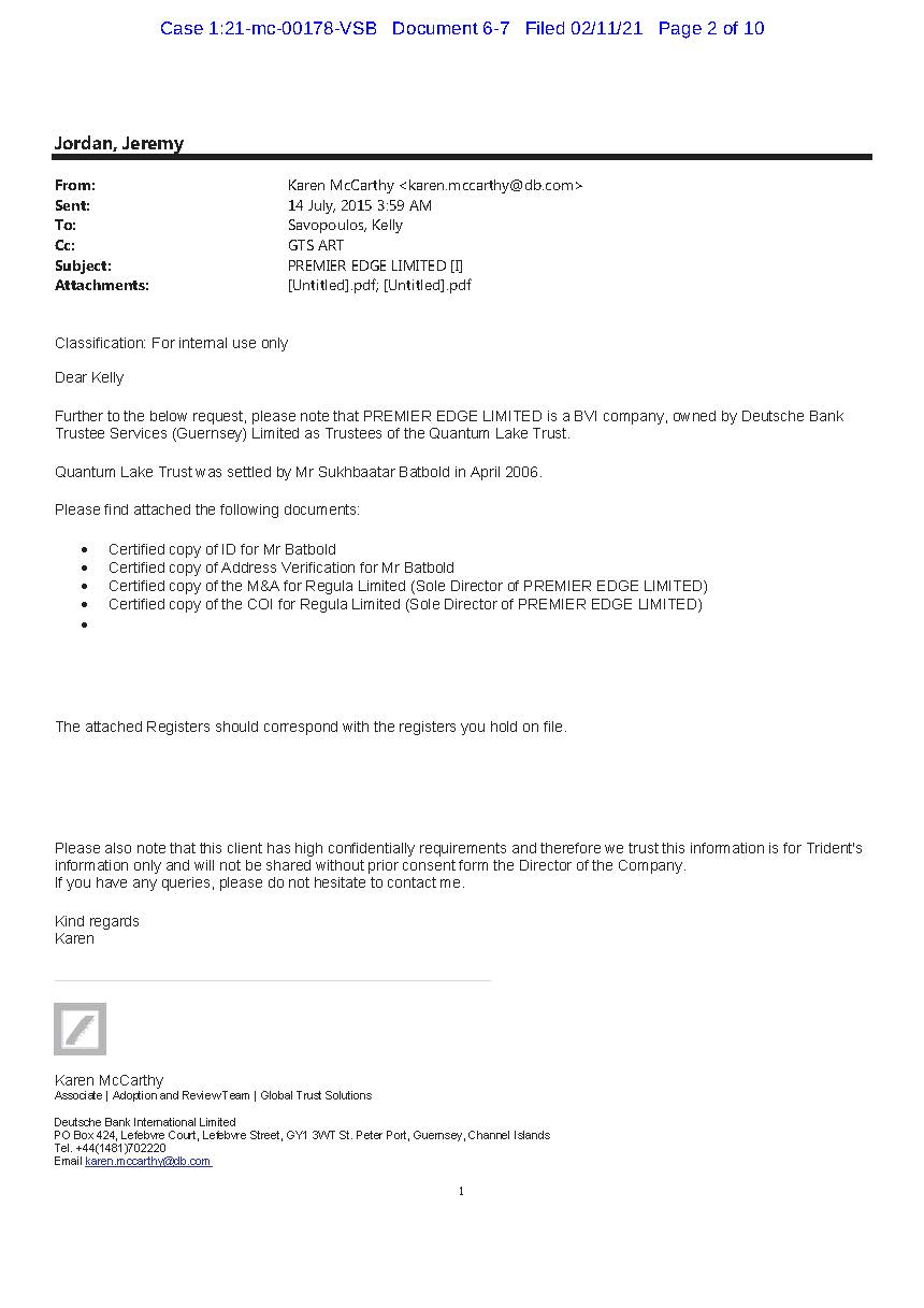 In the email to which Batbold’s passport is attached, the Deutsche Bank employee stressed that the fact Batbold owned Premier Edge was not to be shared with anyone without Batbold’s approval, writing that “this client has high confidentiality requirements” (page 2 of exhibit 7).