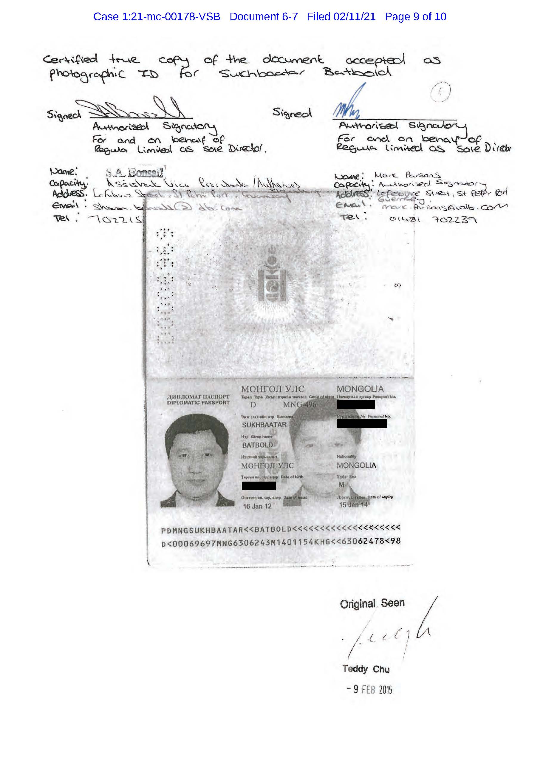 (The authenticity of Batbold’s passport is certified by two Deutsche Bank employees in their capacity as directors of Regula Limited. Regula is a shell company created by Deutsche Bank. The International Consortium of Independent Journalists reports that it has been implicated in Deutsch Bank’s money laundering activities.)