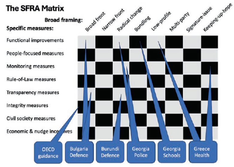 The process again involves a structure making choices, this one in the form of a matrix with the broad categories as columns and the detailed measures as rows. The different combinations are then examined through ten “lenses,” the authors term for different ways of thinking through how the reforms will play out in practice: who will support them and who will oppose them; how the election calendar will affect the choices; what resources are at-hand, and other intensely practical matters likely to make a difference between success and not. An example matrix, shown on page 131, is reproduced below.