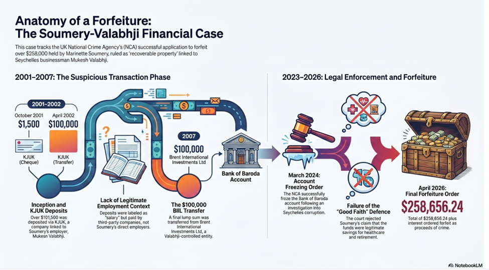 In its forfeiture application, the NCA linked the money to companies and individuals associated with Valabhji and showed he and Soumery had taken elaborate steps to disguise its source. Because of the “highly suspicious” actions taken to hide where the funds came from, their links to Valabhji and associates, and Soumery and Valabhji’s inability to offer a credible explanation for their origin, the court ordered the money forfeited pursuant to the Proceeds of Crime Act, ruling: