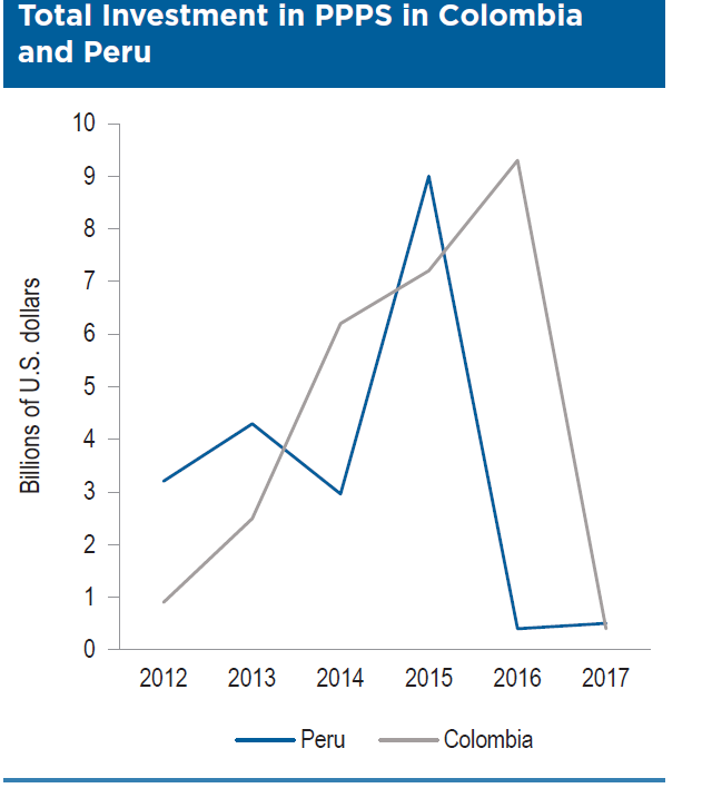 Most large infrastructure contracts in Peru and Colombia are in the form of Public-Private Partnerships (PPPs), and the immediate termination of a PPP can be enormously costly.  Not only to the firms that paid bribes to secure the contract, but to lenders, suppliers, and the hundreds of other contractors on the project who had no knowledge or involvement in the bribery scheme.  The greatest costs are likely be felt by the citizens of Colombia and Peru.  For as the chart shows, the consequence of zero tolerance is a halt to new spending for roads, power, and other essential facilities as investors and project developers shy away from the risk future contracts will be terminated for the tiniest of infractions by anyone associated with the project.